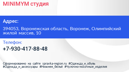MINIMYM, студия по адресу 394053, Воронежская область, Воронеж, Олимпийский жилой массив, 10 в дальнейшем Организация, размещена в следующих категориях: