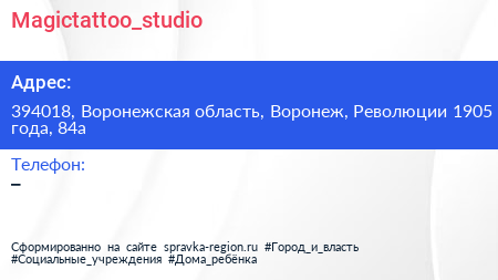 Magictattoo_studio по адресу 394018, Воронежская область, Воронеж, Революции 1905 года, 84а в дальнейшем Организация, размещена в следующих категориях: