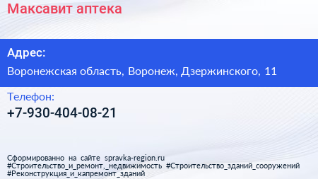 Максавит, аптека по адресу Воронежская область, Воронеж, Дзержинского, 11 в дальнейшем Организация, размещена в следующих категориях: