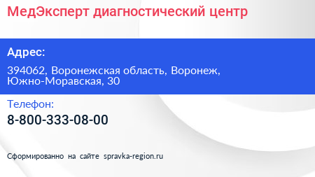 МедЭксперт, диагностический центр по адресу 394062, Воронежская область, Воронеж, Южно-Моравская, 30 в дальнейшем Организация, размещена в следующих категориях: