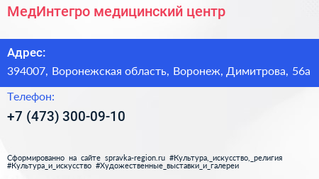 МедИнтегро, медицинский центр по адресу 394007, Воронежская область, Воронеж, Димитрова, 56а в дальнейшем Организация, размещена в следующих категориях: