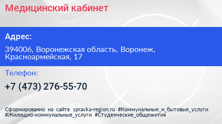 Медицинский кабинет по адресу 394006, Воронежская область, Воронеж, Красноармейская, 17 в дальнейшем Организация, размещена в следующих категориях: