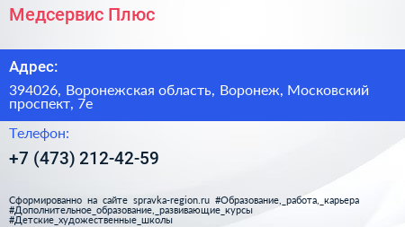 Медсервис Плюс по адресу 394026, Воронежская область, Воронеж, Московский проспект, 7е в дальнейшем Организация, размещена в следующих категориях: