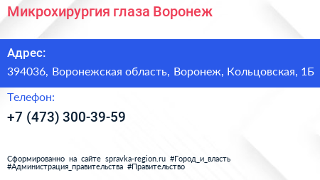Микрохирургия глаза-Воронеж по адресу 394036, Воронежская область, Воронеж, Кольцовская, 1Б в дальнейшем Организация, размещена в следующих категориях:
