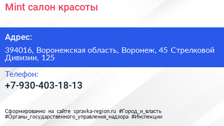 Mint, салон красоты по адресу 394016, Воронежская область, Воронеж, 45 Стрелковой Дивизии, 125 в дальнейшем Организация, размещена в следующих категориях: