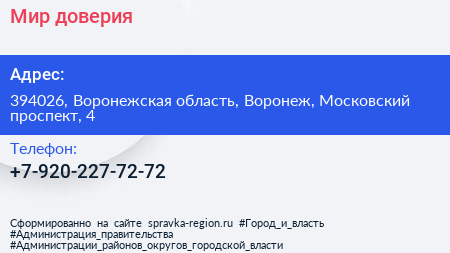 Мир доверия по адресу 394026, Воронежская область, Воронеж, Московский проспект, 4 в дальнейшем Организация, размещена в следующих категориях: