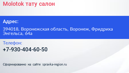 Molotok, тату-салон по адресу 394018, Воронежская область, Воронеж, Фридриха Энгельса, 64а в дальнейшем Организация, размещена в следующих категориях: