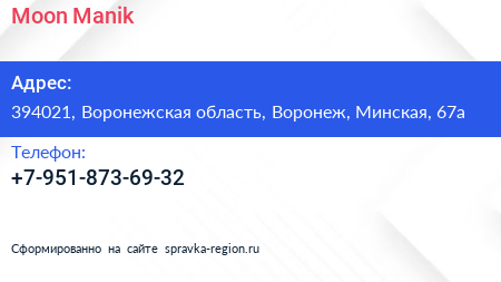 Moon Manik по адресу 394021, Воронежская область, Воронеж, Минская, 67а в дальнейшем Организация, размещена в следующих категориях: