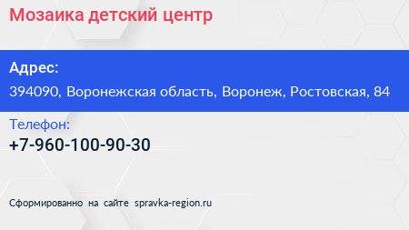 Мозаика, детский центр по адресу 394090, Воронежская область, Воронеж, Ростовская, 84 в дальнейшем Организация, размещена в следующих категориях: