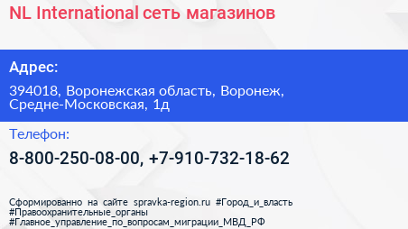 NL International, сеть магазинов по адресу 394018, Воронежская область, Воронеж, Средне-Московская, 1д в дальнейшем Организация, размещена в следующих категориях: