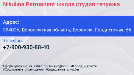 Nikulina Permanent, школа-студия татуажа по адресу 394006, Воронежская область, Воронеж, Гродненская, 65 в дальнейшем Организация, размещена в следующих категориях:
