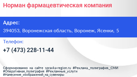 Норман, фармацевтическая компания по адресу 394053, Воронежская область, Воронеж, Ясенки, 5 в дальнейшем Организация, размещена в следующих категориях: