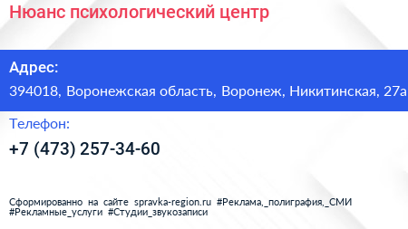 Нюанс, психологический центр по адресу 394018, Воронежская область, Воронеж, Никитинская, 27а в дальнейшем Организация, размещена в следующих категориях: