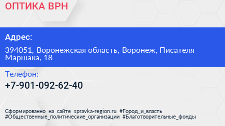 ОПТИКА ВРН по адресу 394051, Воронежская область, Воронеж, Писателя Маршака, 18 в дальнейшем Организация, размещена в следующих категориях: