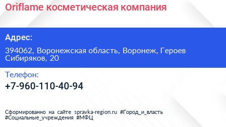 Oriflame, косметическая компания по адресу 394062, Воронежская область, Воронеж, Героев Сибиряков, 20 в дальнейшем Организация, размещена в следующих категориях: