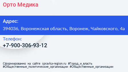 Орто Медика по адресу 394036, Воронежская область, Воронеж, Чайковского, 4а в дальнейшем Организация, размещена в следующих категориях: