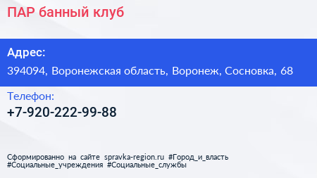ПАР, банный клуб по адресу 394094, Воронежская область, Воронеж, Сосновка, 68 в дальнейшем Организация, размещена в следующих категориях: