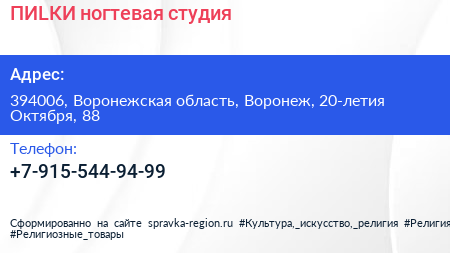 ПИLКИ, ногтевая студия по адресу 394006, Воронежская область, Воронеж, 20-летия Октября, 88 в дальнейшем Организация, размещена в следующих категориях:
