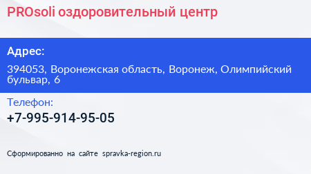 PROsoli, оздоровительный центр по адресу 394053, Воронежская область, Воронеж, Олимпийский бульвар, 6 в дальнейшем Организация, размещена в следующих категориях: