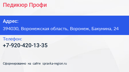 Педикюр Профи по адресу 394030, Воронежская область, Воронеж, Бакунина, 24 в дальнейшем Организация, размещена в следующих категориях:
