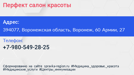 Перфект, салон красоты по адресу 394077, Воронежская область, Воронеж, 60 Армии, 27 в дальнейшем Организация, размещена в следующих категориях: