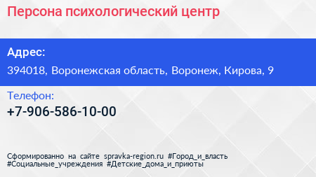 Персона, психологический центр по адресу 394018, Воронежская область, Воронеж, Кирова, 9 в дальнейшем Организация, размещена в следующих категориях: