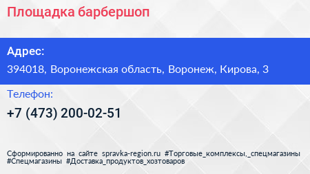 Площадка, барбершоп по адресу 394018, Воронежская область, Воронеж, Кирова, 3 в дальнейшем Организация, размещена в следующих категориях:
