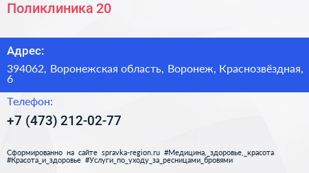 Поликлиника №20 по адресу 394062, Воронежская область, Воронеж, Краснозвёздная, 6 в дальнейшем Организация, размещена в следующих категориях: