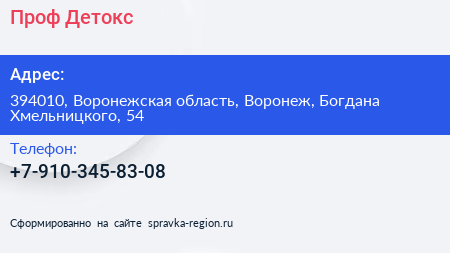 Проф Детокс по адресу 394010, Воронежская область, Воронеж, Богдана Хмельницкого, 54 в дальнейшем Организация, размещена в следующих категориях: