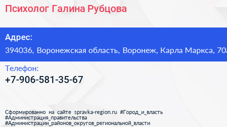 Психолог Галина Рубцова по адресу 394036, Воронежская область, Воронеж, Карла Маркса, 70а в дальнейшем Организация, размещена в следующих категориях: