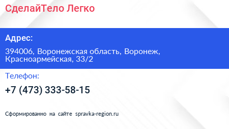СделайТело.Легко. по адресу 394006, Воронежская область, Воронеж, Красноармейская, 33/2 в дальнейшем Организация, размещена в следующих категориях: