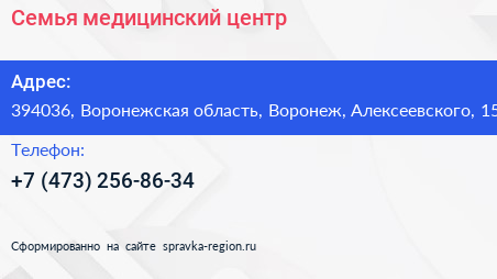 Семья, медицинский центр по адресу 394036, Воронежская область, Воронеж, Алексеевского, 15 в дальнейшем Организация, размещена в следующих категориях: