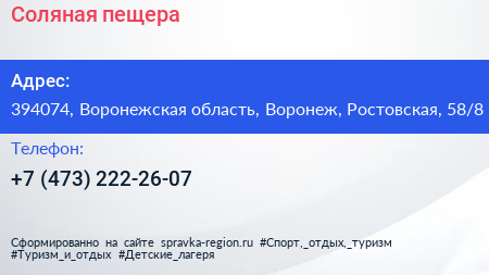 Соляная пещера по адресу 394074, Воронежская область, Воронеж, Ростовская, 58/8 в дальнейшем Организация, размещена в следующих категориях: