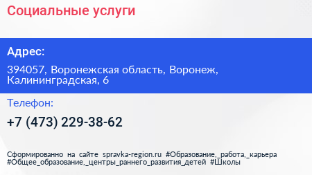 Социальные услуги по адресу 394057, Воронежская область, Воронеж, Калининградская, 6 в дальнейшем Организация, размещена в следующих категориях: