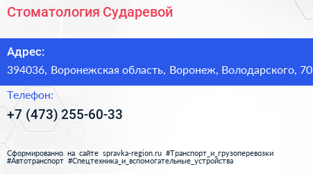 Стоматология Сударевой по адресу 394036, Воронежская область, Воронеж, Володарского, 70 в дальнейшем Организация, размещена в следующих категориях: