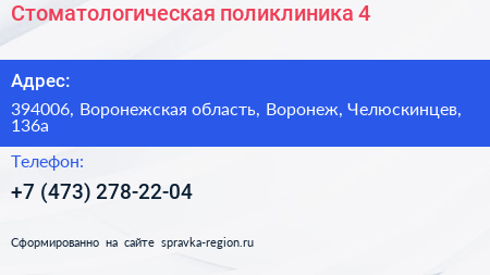 Стоматологическая поликлиника №4 по адресу 394006, Воронежская область, Воронеж, Челюскинцев, 136а в дальнейшем Организация, размещена в следующих категориях: