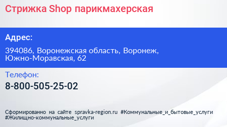 Стрижка Shop, парикмахерская по адресу 394086, Воронежская область, Воронеж, Южно-Моравская, 62 в дальнейшем Организация, размещена в следующих категориях: