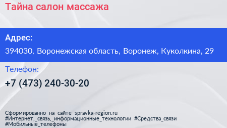 Тайна, салон массажа по адресу 394030, Воронежская область, Воронеж, Куколкина, 29 в дальнейшем Организация, размещена в следующих категориях: