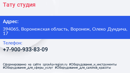 Тату-студия по адресу 394065, Воронежская область, Воронеж, Олеко Дундича, 17 в дальнейшем Организация, размещена в следующих категориях: