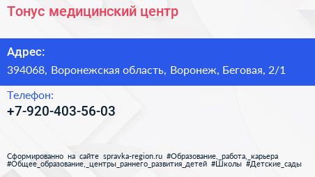 Тонус, медицинский центр по адресу 394068, Воронежская область, Воронеж, Беговая, 2/1 в дальнейшем Организация, размещена в следующих категориях: