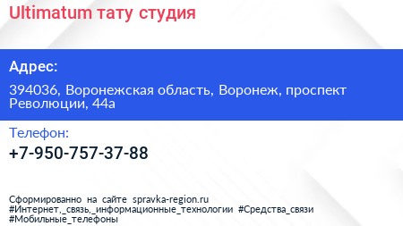 Ultimatum, тату-студия по адресу 394036, Воронежская область, Воронеж, проспект Революции, 44а в дальнейшем Организация, размещена в следующих категориях: