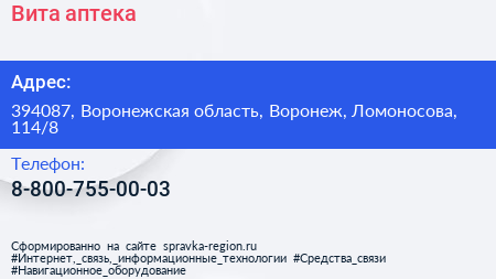 Вита, аптека по адресу 394087, Воронежская область, Воронеж, Ломоносова, 114/8 в дальнейшем Организация, размещена в следующих категориях: