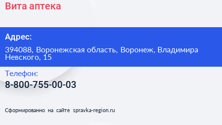 Вита, аптека по адресу 394088, Воронежская область, Воронеж, Владимира Невского, 15 в дальнейшем Организация, размещена в следующих категориях: