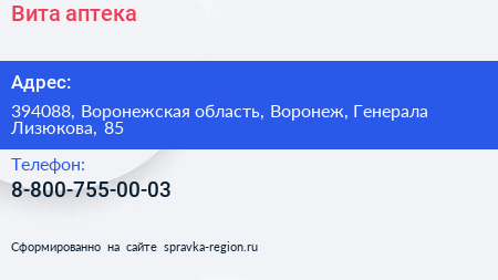 Вита, аптека по адресу 394088, Воронежская область, Воронеж, Генерала Лизюкова, 85 в дальнейшем Организация, размещена в следующих категориях: