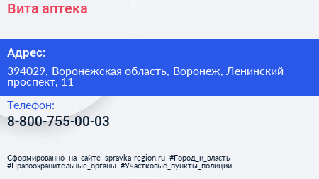 Вита, аптека по адресу 394029, Воронежская область, Воронеж, Ленинский проспект, 11 в дальнейшем Организация, размещена в следующих категориях: