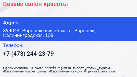 Визави, салон красоты по адресу 394044, Воронежская область, Воронеж, Калининградская, 108 в дальнейшем Организация, размещена в следующих категориях: