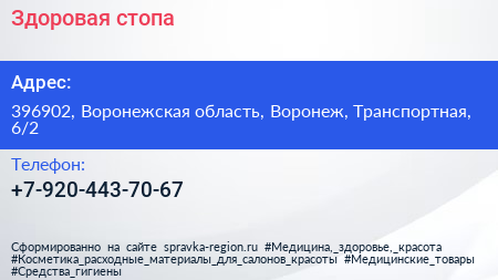 Здоровая стопа по адресу 396902, Воронежская область, Воронеж, Транспортная, 6/2 в дальнейшем Организация, размещена в следующих категориях: