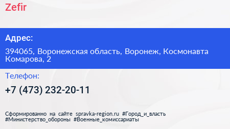 Zefir по адресу 394065, Воронежская область, Воронеж, Космонавта Комарова, 2 в дальнейшем Организация, размещена в следующих категориях: