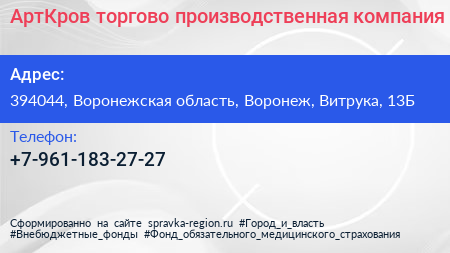 АртКров, торгово-производственная компания по адресу 394044, Воронежская область, Воронеж, Витрука, 13Б в дальнейшем Организация, размещена в следующих категориях: