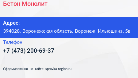 Бетон-Монолит по адресу 394028, Воронежская область, Воронеж, Ильюшина, 5в в дальнейшем Организация, размещена в следующих категориях: